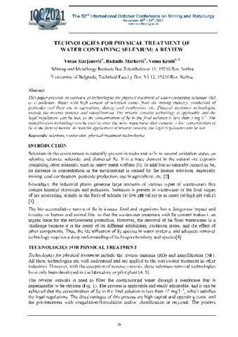 Abstract This paper presents an overview o f technologies for physical treatment o f water containing selenium (Se) as a pollutant. Water with high content o f selenium comes from the mining industry, production of pesticides and their use in agriculture, during coal combustion, etc. Physical treatment technologies include the reverse osmosis and nanofiltration. The reverse osmosis technology is applicable and the legal regulations can be met, as the concentration o f Se in the final solution is less than 5 mg L -1. The nanofiltration technology can be used to treat the mine wastewater that contains a low concentration of Se in the form o f metals. As with the application o f reverse osmosis, the legal regulations can be met.