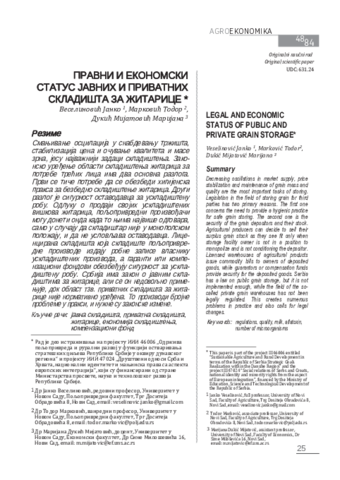 Резиме: Смањивање осцилација у снабдевању тржишта, стабилизација цена и очување квалитета и масе зрна, јесу најважнији задаци складиштења. Законско уређење области складиштења житарица за потребе трећих лица има два основна разлога. Први се тиче потребе да се обезбеди хигијенска пракса за безбедно складиштење житарица. Други разлог је сигурност оставодавца за ускладиштену робу. Одлуку о продаји својих ускладиштених вишкова житарица, пољопривредни произвођачи могу донети онда када то њима највише одговара, само у случају да складиштар није у монополском положају, и да не условљава оставодавца. Лиценцирана складишта која складиште пољопривредне производе издају робне записе власнику ускладиштених производа, а гаранти или компензациони фондови обезбеђују сигурност за ускладиштену робу. Србија има закон о јавним скла- диштима за житарице, али се он недовољно приме- њује, док област тзв. приватних складишта за житарице није нормативно уређена. То производи бројне проблеме у пракси, и нужне су законске измене.