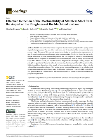 Abstract: Reliable measurement of surface roughness (Ra) is extremely important for quality control of production processes. The cost of the equipment and the duration of the measurement process are very high. The aim of this work is to develop a device for non-destructive measurement of specific roughness levels on stainless steel using computer vision. The device should be structurally simple, affordable, accurate, and safe for practical use. The purpose of the device is to effectively detect the level of roughness of the treated surface obtained by the water jet cutting process. On the basis of the obtained results, it is possible to adjust the parameters during the cutting process. The principle of operation of the device is based on measuring the intensity of the visible spectrum of the light reflected from the surface of the sample to be measured and correlating these values with the values of the measured roughness. After testing several variants of the device, the so-called vertical measurement variant was developed using the following equipment: violet light LED, optical filter and light splitter, USB 2.0 web camera, Arduino microcontroller, personal computer, and LabView programming interface.