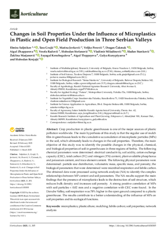 Abstract: Crop production in plastic greenhouses is one of the major sources of plastic pollution worldwide. The main hypothesis of this study is that the regular use of mulch film in greenhouses leads to the cumulative accumulation of microplastic particles (MPs) in the soil, which ultimately leads to changes in the soil properties. Therefore, the main objective of this study was to identify the possible changes in the physical, chemical, and biological properties of soil in greenhouses in three regions of Serbia. The following chemical parameters were determined: electrical conductivity, soil acidity, cation exchange capacity (CEC), total carbon (TC) and nitrogen (TN) content, plant-available phosphorus and potassium content, and trace element content. The following physical parameters were determined: particle size distribution, volumetric mass, specific mass, and porosity; the biological parameters that were determined were microbial respiration and labile carbon. The obtained data were processed using network analysis (NA) to identify the complex relationships between MP content and soil parameters. The NA results support the main findings that the presence of microplastics leads to the destruction of soil structure, which reduces bulk density and increases soil porosity. A strong positive correlation of MPs with soil particles < 0.02 mm and a negative correlation with CEC were found. In the Danube Valley, soil respiration was 78% higher in the open ground compared to a plastic greenhouse. The results contribute to a better understanding of the influence of MPs on soil properties and its ecological functions.